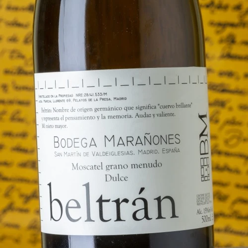 The 2015 Beltrán is a late harvest sweet white wine produced with Moscatel grapes. There are only a handful of bottles of this wine which is 14,83% alcohol and has 60 grams of unfermented sugar, which talk about the over-ripeness of the grapes when they were picked. The grapes come from young vines in Peña Caballera, from individual plants found intermixed with the reds, but the wine is probably marked by the process more than the place. It fermented in glass demijohns (52 liters) and was bottled, unfiltered and unfined, two years after the harvest. They have been experimenting with sweet wines since 2009, but this 2015 is the first to be released. It has some balsamic aromas reminiscent of bay leaf and a touch of condensed milk. The palate is sweet without excess. Only 120 bottles were filled in September 2017.